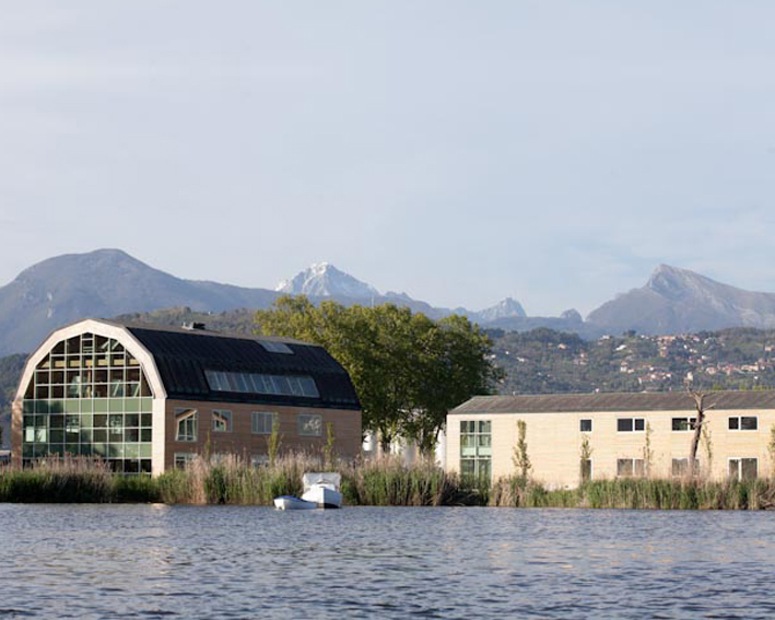 Il Progetto è stato concepito nel rispetto dell’ambiente circostante e della memoria simbolica degli edifici preesistenti, cercando di sottolineare gli aspetti industriali delle cave di estrazione della sabbia che sono richiamati dalla morfologia dei fabbricati e attraverso i materiali che ricordano sia la pre- cedente funzione industriale, sia quella contemporanea del terziario. Le sagome planimetriche dei due edifici principali sono organizzate nel lotto in modo da creare uno spazio fronte-lago raccolto e pro- tetto dalla viabilità esterna.