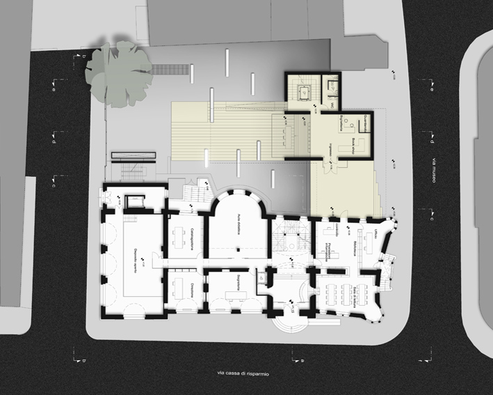 Considerata la particolarità del contesto, il progetto si è articolato attorno all’idea di creare un volume astratto e leggerissimo, una camera di luce che racchiudesse gli spazi espositivi, facendo filtrare al loro interno una luce diffusa e mutevole. Così l’involucro esterno si è definito in una “pelle” di vetro giallo tenue i cui pannelli, parzialmente sovrapposti, ne hanno disegnato il profilo mistilineo.