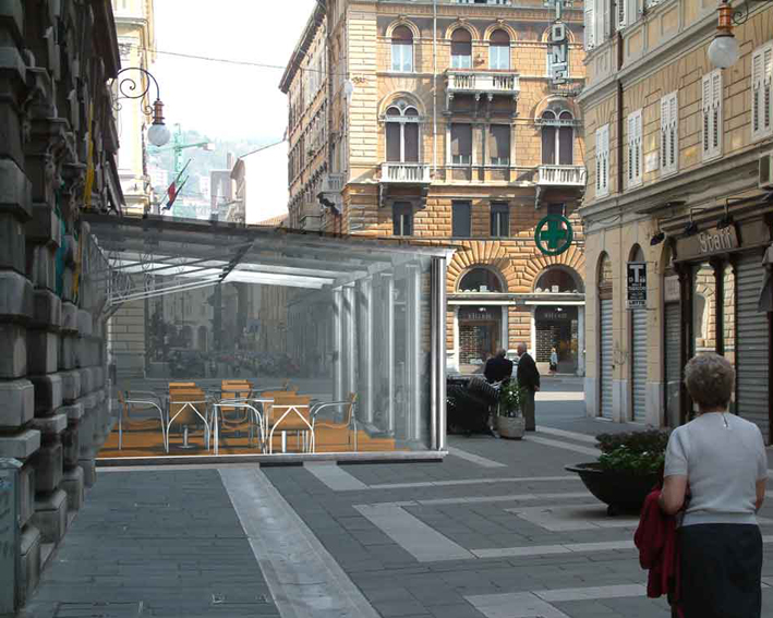 Per dehors si intende l’insieme degli elementi mobili disposti su un’area pubblica, privata o gravata da servitù di uso pubblico, organizzati in modo da delimitare e arredare in maniera organica e funzionale uno spazio per la somministrazione di cibi e bevande di pertinenza di un esercizio pubblico (bar o ristorante). Il regolamento definisce anche i tipi di aree urbane nelle quali i dehors si inseriscono e l’articolazione in sistemi e sottosistemi di spazi pubblici che costituiscono una griglia di riferimento per la lettura del territorio urbano. In ciascuno di essi sono consentite particolari tipologie di dehors. Per le aree della città di Trieste di particolare rilevanza ai fini del Regolamento, sono stati realizzati dei progetti specifici. L’inserimento di dehors in tali aree e, più in generale, nel centro storico di Trieste, è soggetto a vincoli maggiori, sia dal punto di vista for- male che dimensionale. Sono stati individuati tre sistemi: storico (per il centro), blu (per le zone legate al mare) e verde (per quelle verdeggianti). Le varianti dehors Classico e Contemporaneo aggiungono ulteriore ricchezza, varietà e adattabilità al sistema urbano.