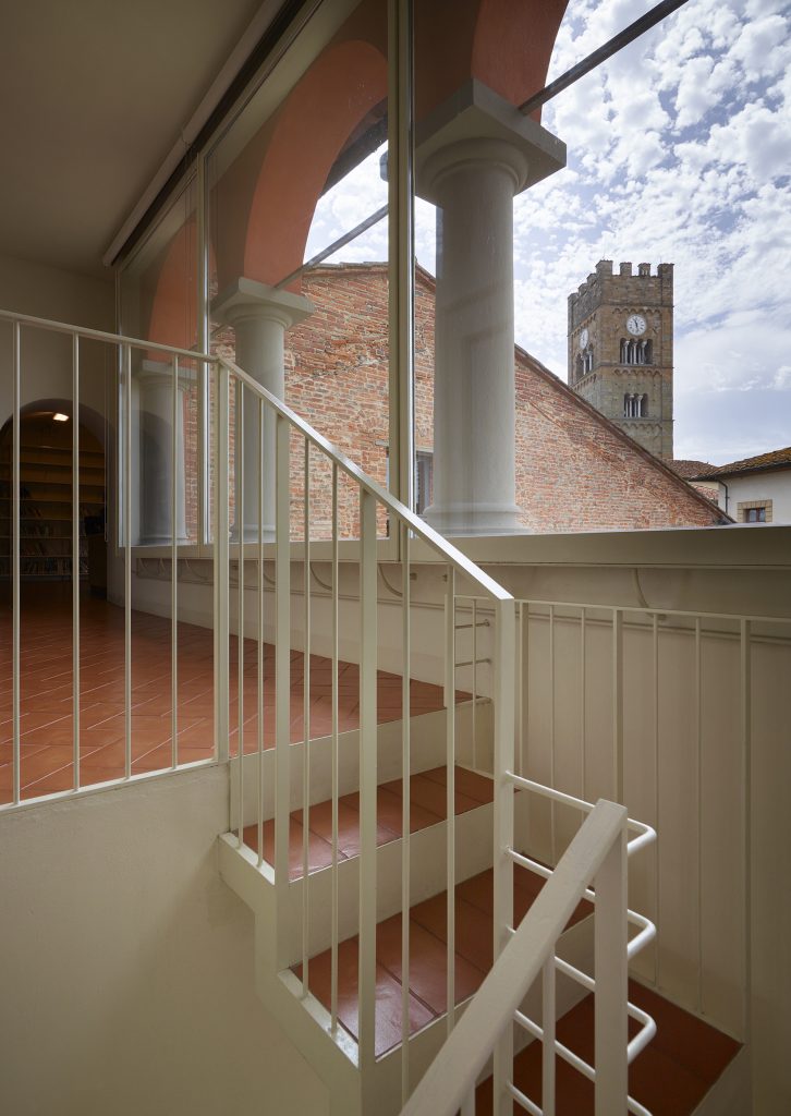 Al piano primo e secondo rimane ubicata la biblioteca che è collegata al piano terra dalla scala esterna esistente e da un nuovo ascensore per consentire l’accesso anche ai disabili senza intervenire in modo invasivo sul fabbricato. Un ulteriore ascensore esterno è previsto vicino alla terrazza e rifinito con un rivestimento esterno di lamiera in corten incisa da parole dedicate ai Cavalieri del Tau, la via Francigena e la Biblioteca. Al piano terra è previsto un adeguamento di tipo strutturale per realizzare la soprastante biblioteca e conservare i reperti archeologici ritrovati durante i lavori di restauro.